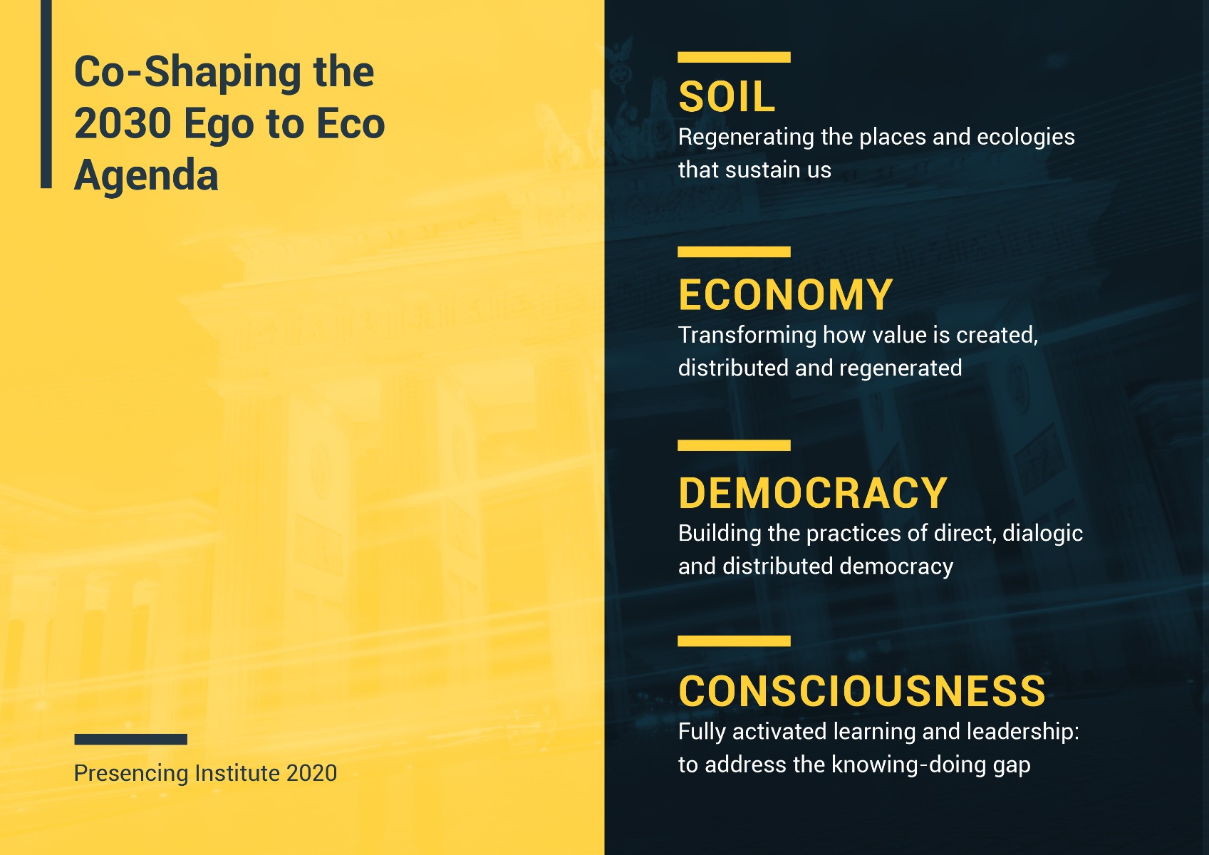 Strengthening our connection with each other and with our deeper sources of generativity, we may step away from blind, panicked reactivity towards responsive action, encouraged by the efforts and successes of so many others across the globe. We invite you to join us for the Presencing Institute’s Global Forum, 10 & 11 July 2020 – to build Action Confidence individually and collectively, to activate further seeds of possibility for Regeneration and Renewal, and set our Agenda for 2030. Participation format and cost are currently still being designed. Further program details will be shared soon.